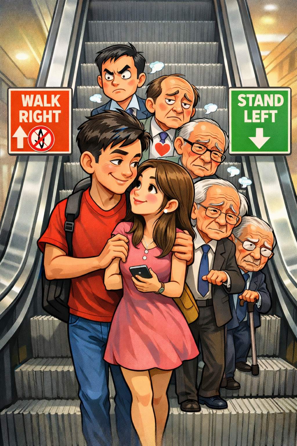 There is an unspoken rule. Stand left, walk right. Yet somehow, someone plants themselves firmly on the right side like they are guarding a national treasure, or conducting romantic bonding at 8.45am. Behind them, a line of office workers is aging in real time.
