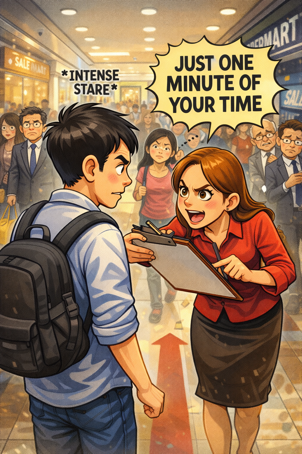 You just want to walk peacefully. Suddenly someone steps into your path with a clipboard and intense eye contact. “Just one minute of your time.” It has never been one minute in the history of mankind.