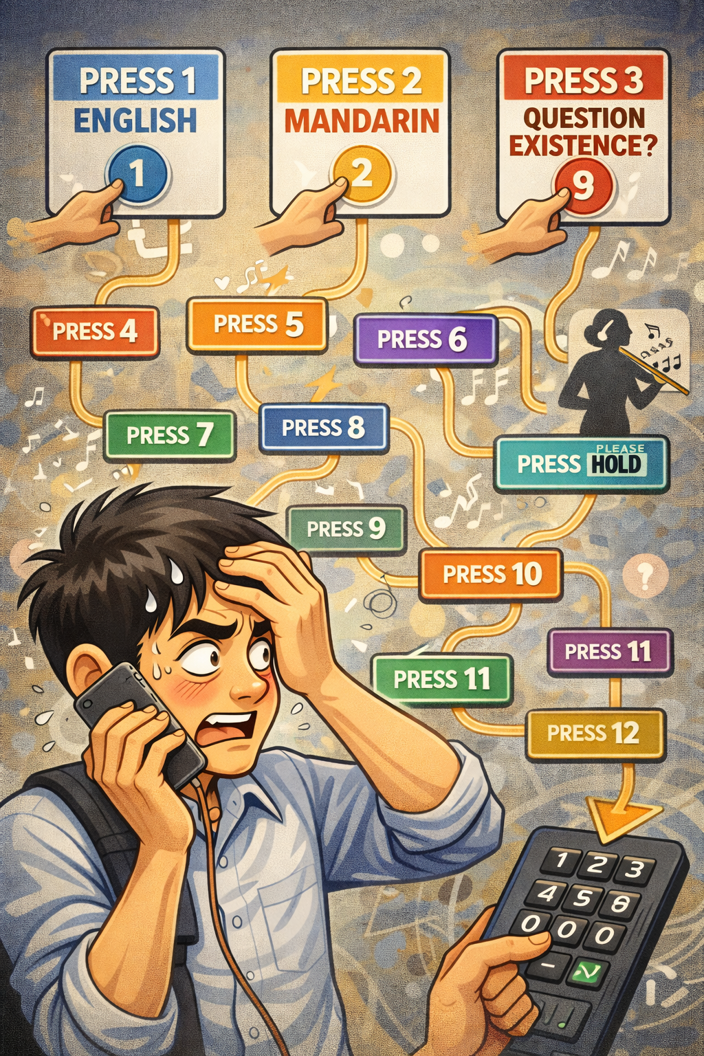 You call for help. Press 1 for English. Press 2 for Mandarin. Press 3 to question your existence. After 14 options and a flute soundtrack, you still cannot locate a human voice.