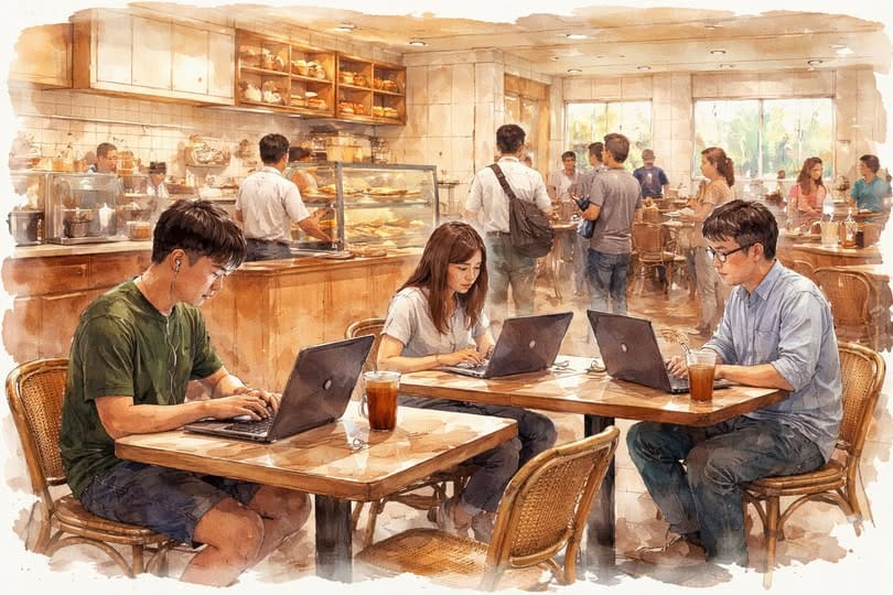 Orders one drink at 9am. Opens laptop. Conducts zoom meetings. Lunch crowd arrives. Still there. One empty cup beside them. One sad muffin, half eaten, serving as a decoy meal. The table has officially been annexed into a private co-working territory until 5pm. This is their office now. They pay $7 rent per day. The lease includes unlimited WiFi and the quiet suffering of everyone around them.