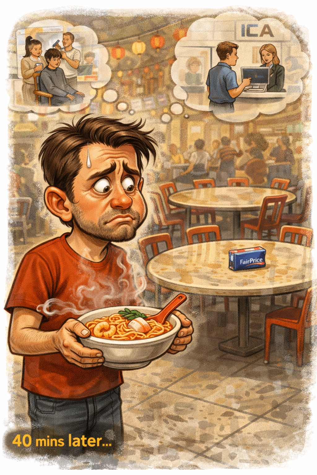 A lone packet of FairPrice tissues sits on a table for six. The owner has been gone so long they’ve probably finished their meal, gone for a haircut, and are currently renewing their passport at ICA. Meanwhile, you are standing there holding a hot bowl of Laksa like a human statue.