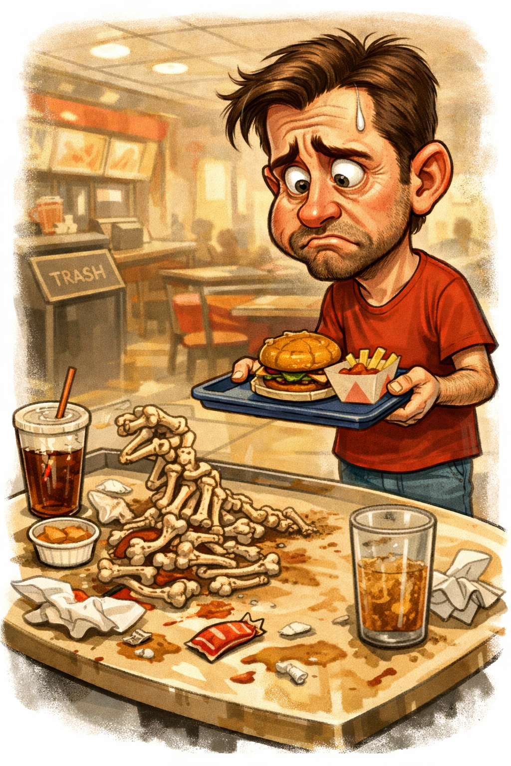 You spot a free table. Victory. You walk over with your tray, hope in your eyes. Then you see it. Chicken bones arranged like a crime scene. A tissue that has lived a full life. Three puddles of unknown origin. Half a cup of something that used to be iced milo, now just commitment issues.
