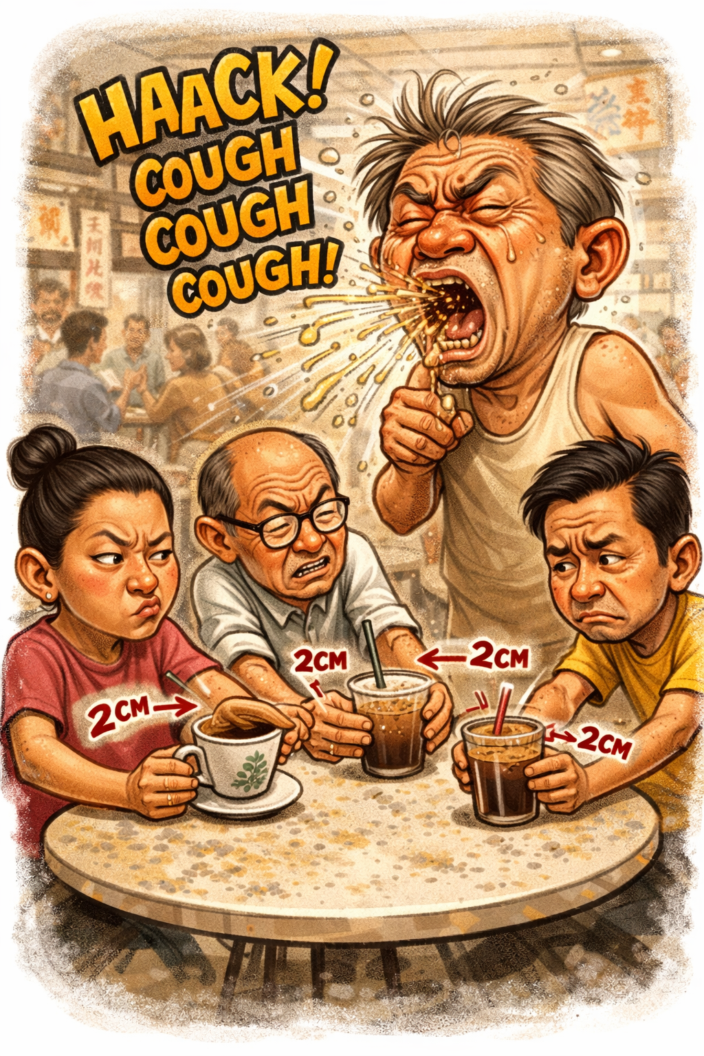 A powerful cough echoes across the kopitiam. No cover. No apology. Just surround sound. Everyone instinctively moves their drinks two centimeters away.